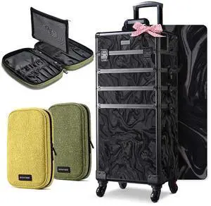 Byootique 4in1 Rolling Makeup Case with 2 Makeup Brush Bag, Cosmetic Train Case on Wheels for Makeup Artist Travel Hairstylist