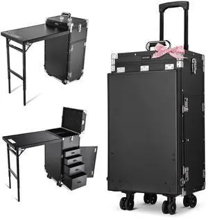 Byootique Rolling Makeup Train Case Patented Design Pedicure Nail Salon Nail Foldable Trolley Cosmetic Organizer Black with Stool