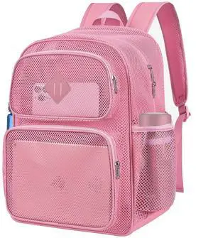 Mesh Backpack for School, Heavy Duty See Through Net Bookbag for Girls Boys Kids, 27L Large Capacity Mesh Bookbag for Beach Work Sports Travel with Padded Strap(Pink)