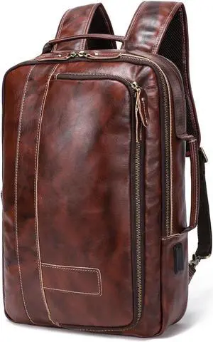 LANNSYNE Leather Backpack For Men, 15.6" Leather Laptop Backpack Hiking Travel Bag Camping Rucksack