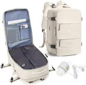 Vacuum Travel Backpack with Pump for Women,Personal Item Carry on Backpacks Flight Approved 18x14x8 inches for Men,Laptop Waterproof Work Compression bags Casual Daypack(White)