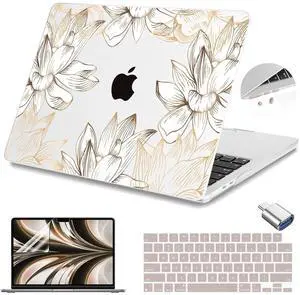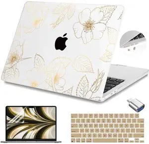Teryeefi Compatible with M4 MacBook Air 13.6 inch Case 2022-2025 Release M3 A3113 M2 A2681 with Touch ID, Design Hard Shell Case+Keyboard Cover+Screen Protector+Type C Adapter, W-Gold Flower Line
