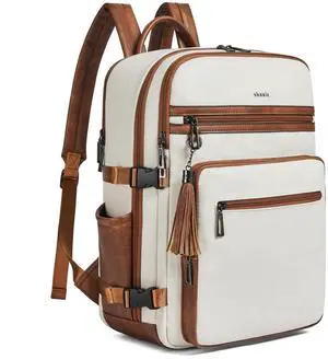 Shrrie Laptop Backpack for Women,Vegan Leather Backpack Work Computer Backpacks fits 16" Laptop,Water Resistant Teacher Nurse Casual Daypack for Weekender Camping Travel,Beige with Brown