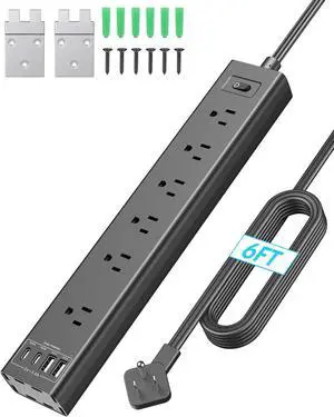 Mountable Power Strip, Wall Mount Surge Protector Power Strip with USB Ports, 6ft Flat Plug Extension Cord with Multiple Outlets for Under Desk/TV Behind