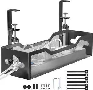 Under Desk Cable Management Tray No Drill, Metal Mesh Cable Management Under Desk with Clamp Mount, 2 Hole Cable Tray with Wire Management and Cord Organizer for Home Office Standing Desk