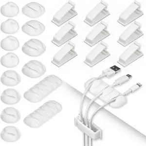 64 Pieces Cable Clips Kit Including 50Pcs Strong Self-Adhesive Organizer Clips and 14Pcs Desk Clips Set, Multipurpose Wire Management Clamps for Tablet Laptop Computer TV Home Office Car (White)
