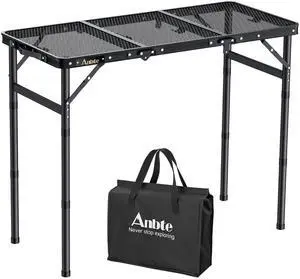Anbte Folding Grill Table, 3ft Tri-Fold Aluminum Folding Table Adjustable Height Max 27.5" Grill Table with Mesh Desktop, Lightweight, Portable Handle for Outdoor Cooking BBQ Picnic (Black)