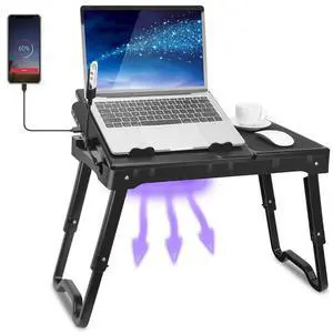 Laptop Desk for Bed, Adjustable Table with Fan, Portable Lap Desk, Foldable Legs, Stand for Couch Sofa, Tray with LED Light, 4 USB Ports, Storage, Mouse Pad