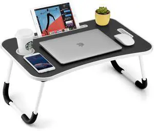 Foldable Laptop Table, Portable Lap Desk Bed Table Tray, Laptop Stand with Cup Holder & Tablet Slot & Lifting Handle for Working Writing Drawing & Eating (Black)