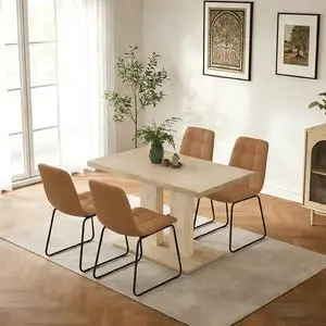 Dining Table Set for 4-6 People, 46 Inch Modern MDF Oak Kitchen Table with 4 Faux Leather Chairs, Rectangular Dining Room Table Set for Home, Small Spaces, Oak Wood Table + 4 Beige Chairs