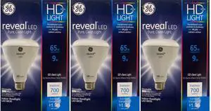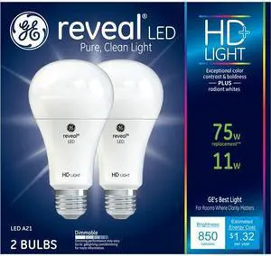 (2 bulbs) GE Reveal LED A19 HD Light, 75 watt replacement, Pure Clean Light, Dimmable