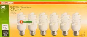 Sylvania CFL T2 Twist Light Bulb, 2700K Soft White, 60 watt Equivalent, Efficient 13 watts, 850 Lumens, medium base Compact Fluorescent (pack of 6 bulbs)