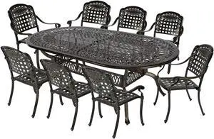 MEETWARM 7-Piece Outdoor Furniture Dining Set, All Weather Cast Aluminum Patio Garden Set with 6 Chairs, 6 Cushions, 1 Rectangular Table, 2" Umbrella Hole, Dark Bronze