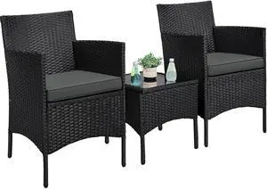 Yaheetech 3 Pieces Patio Porch Furniture Set, Outdoor PE Rattan Wicker Conversation Set with Soft Cushions, Glass Coffee Table & 2 Chairs for Garden/Deck/Courtyard/Poolside, Black/Gray