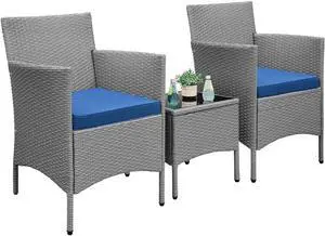 Yaheetech 3 Pieces Patio Porch Furniture Set, Outdoor PE Rattan Wicker Conversation Set with Soft Cushions, Glass Coffee Table & 2 Chairs for Garden/Deck/Courtyard/Poolside, Gray/Dark Blue