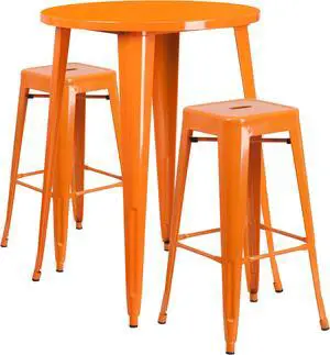 30'' Round Orange Metal Indoor-Outdoor Bar Table Set with 2 Square Seat Backless Stools