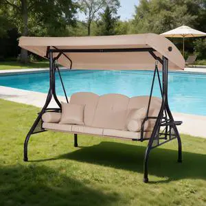 VANBOW 3-Seat Outdoor Porch Swing with Adjustable Canopy, 2 in 1 Convertible Patio Swing Bed, Patio Glider Swing for Backyard Beige