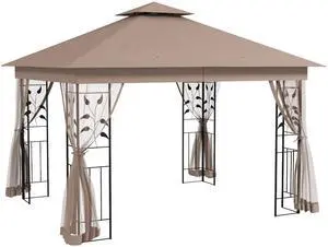 10' x 11.5' Metal Patio Gazebo, Double Roof Outdoor Gazebo Canopy Shelter with Tree Motifs Corner Frame and Netting, for Garden, Lawn, Backyard, and Deck, Brown