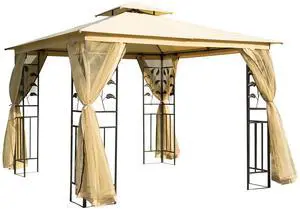 10' x 10' Metal Patio Gazebo, Double Roof Outdoor Gazebo Canopy Shelter with Tree Motifs Corner Frame and Netting, for Garden, Lawn, Backyard, and Deck, Beige