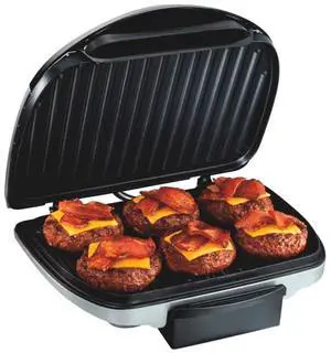 Description: Hamilton Beach Electric Indoor Grill, 6-Serving, Large 90 sq. in. Nonstick, Hamilton Beach, 6-Serving, Silver, 1, 120, 1200 watts, 6.38 L x 12.68 W x 13.78 H inches, Limited