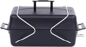 Description: Heavy duty steel and high temperature enameled outer shell provide years of performance. Grill easily removes from cart to allow for Tailgating, Picnics, Campouts and Beach events. Heavy Cast Iron cooking grids for outstanding heat distribution. Precise hood mounted temperature gauge. Large removable warming rack. 3 Stainless steel burners for
