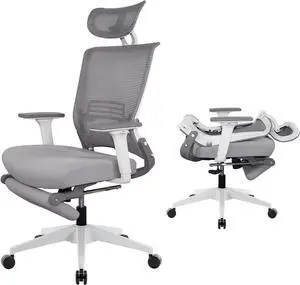 Foldable Ergonomic Office Chair with Footrest, High Back Computer Chair with 2D Headrest, Mesh Back, Sponge Seat, Adjustable Lumbar Support, 2D Armrest, Home Office Desk Chair, Grey
