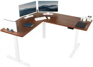 VIVO Electric Stand Up Corner Desk, Dark Walnut Table Tops, White Frame