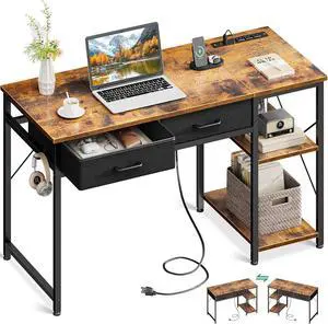 Coleshome Small Computer Desk with Drawers, 40 Inch Reversible Home Office Desk with Power Outlet, Study Laptop Vanity Table with Storage Shelves for Bedroom Small Space, Rustic Brown