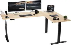 VIVO Electric 78" x 55" Stand Up Corner Desk, Light Wood Table Tops, Black Frame