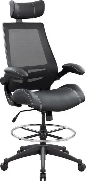 BOLISS Ergonomic Drafting Chair with 4-Level Adjustable Headrest Tall Standing Desk Stool with Soft Microfiber Leather Seat, Breathable Mesh Back, 90° Flip-Up Arms, and Adjustable Foot Ring