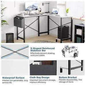 DIXSG L Shaped Gaming Desk with Wooden Desktop CPU Stand Side Bag Reversible for Home Office Small Space, White