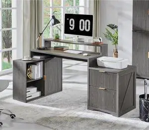 JXQTLINGMU 67" Modern L Shaped Desk with Storage Cabinet & Drawers, Wood Home Office Desk with Power Outlets, Fluted Computer Writing Desk, Grayish Green