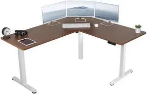 VIVO Electric 63" x 55" Corner Stand Up Desk, Dark Walnut Table Top, White Frame