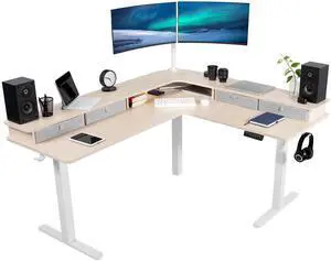 VIVO 2-Tier Electric 63" x 55" Corner Desk, Light Wood Table Top, White Frame