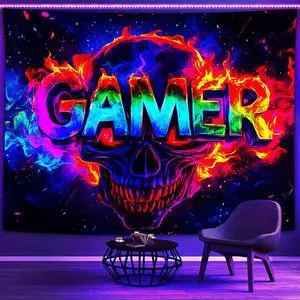Glow in The Dark Skull Theme Games Tapestry 2D Flat - Enigmatic Individual Game Controller Design, UV Reactive Neon Wall Art for Bedroom, Game Room, Dorm, Man Cave Decor(60x40in)