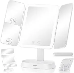 Lighted Makeup Mirror with 7X/5X/1X Magnification, Vanity Mirror with Lights, Trifold Led Makeup Mirror, 3 Lights Colors & Adjustable Brightness, 360° Rotation & Detachable Design for Travel Gift