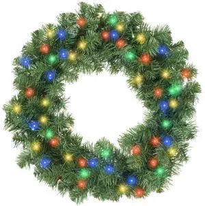 Casafield 24" Pre-Lit Fir Artificial Christmas Wreath Holiday Décor, 50 LED White & Multicolor Lights, 100 PVC Tips for Front Door, Window, or Mantel