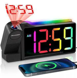 Peakeep Projection Alarm Clock for Bedroom Ceiling, Loud for Heavy Sleepers, RGB Nightlight, Multi-Color Large Display 5 Brightness Dimmer, Plug in Bedside Electric LED Digital Clock with USB Port