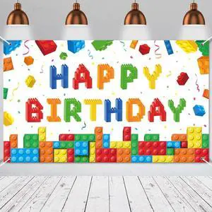 Building Block Birthday Banner Party Backdrop Decoration Happy Birthday Banner Photography Background for Party, 72.8 x 43.3 Inch(White)