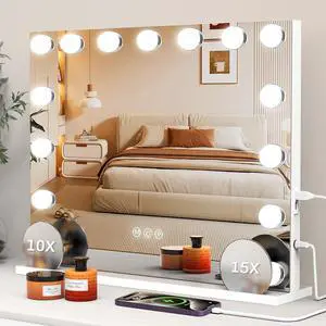 Hollywood Vanity Mirror with 10X/15X Magnification and Lights, USB/Type-C Port Makeup Mirror with 15 Dimmable LED Bulbs, 3 Color Modes, Tabletop & Wall Mount for Bedroom, Aluminum23"x18"