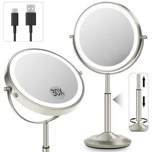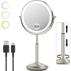 30X/1X Makeup Mirror with Lights, Height Adjustable Lighted Magnifying Vanity Mirror with 3 Lighting and Adjustable Brightness, 3000mAh Rechargeable Double Sided Switch for Desk Women Gift