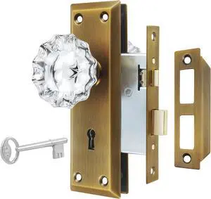 Upgraded Mortise Lock Set for Interior Door, Antique Brass Crystal Glass Door Knobs with Lock and Skeleton Key, Old Style Door Knobs Reversible for Left & Right Handed Door