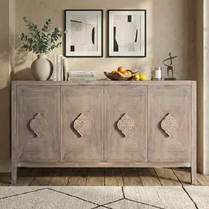 Casheey Antique Brown 4-Door Storage Buffet Cabinet Sideboard with Unique 3D Carved Flower Handles, Adjustable Shelves Console Table, MDF with Pine Veneer Finish for Home Kitchen Living Room