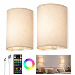 Battery Operated Wall Sconce, Rechargeable Wall Sconces Set of Two with Remote, 3 Color & 80 RGB Wireless Wall Lights, Dimmable, Timer, Fabric Linen Shade Wall Decor for Bedroom, Living Room