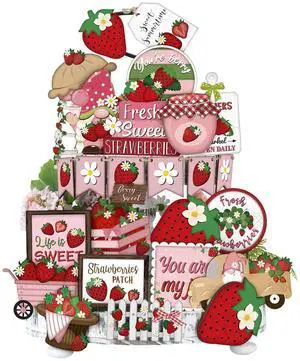 26 Pcs Summer Tiered Tray Decor Sets Farmhouse Summer Gnome Watermelon Strawberry Wood Sign Spring Hawaii Tiered Tray Decorations for Tabletop Home Shelf Kitchen Office(Strawberry)