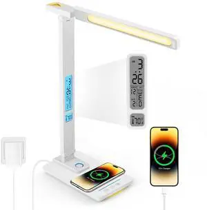 XIZDDL LED Desk Lamp with Wireless Charger, Suitable for Home, Office Dimmable, with USB Charging Port, Built-in Clock, Calendar, Thermometer and Automatic Timing Reading Desk Lamp.