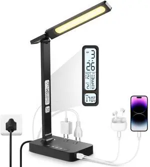 Smart Desk Lamp with 4-in-1 Charging Station (2 AC outlets, Type-C, USB-A Ports), 5 Color temperatures and 5 Brightness Levels, Adjustable gooseneck arm, Eye-Friendly Lighting for desks, bedrooms