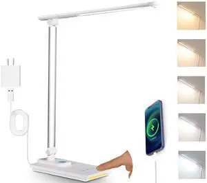White crown LED Desk Lamp with 15W Wireless Charger & USB Port, Dimmable Table Lamp with 5 Lighting Modes, Sensitive Touch Control, Foldable & Portable Desk Light for Home, Office, Bedroom, Reading