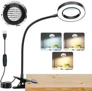 10X Magnifying Glass with Light, Clip on Mganifier with Light, 48 LED Desk Magnifying Glass wtih Clamp, 3 Modes Dimmable Magnifying LED Lamps for Bed Work Crafts DIY Repair