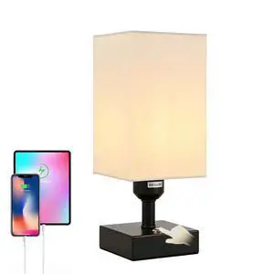 Bedside Table Lamp with Touch Control & USB C+A Charging Ports LED Desk Lamp with 2 AC Outlets, Minimalist Nightstand Light with Black Fabric Shade for Bedroom, Living Room, Office, White